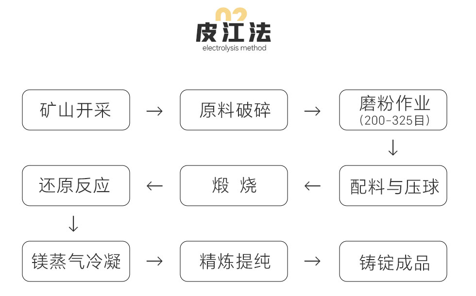 礦山開采→原料破碎→磨粉作業(yè)(200-325目)→配料與壓球→煅燒→還原反應(yīng)→鎂蒸氣冷凝→精煉提純→鑄錠成品